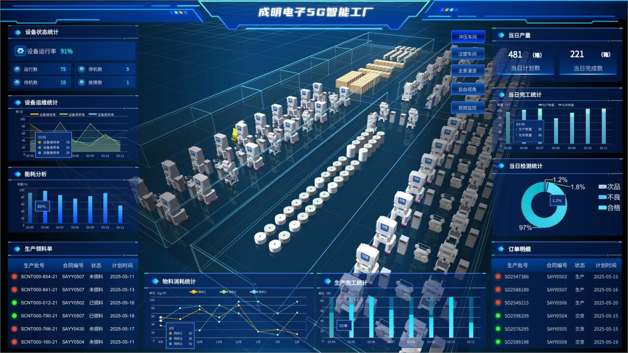 项目通过构建信息系统进行企业数字化转型,解决了企业管理水平与自动化程度不匹配、产品研发与生产环节脱节、质量体系缺陷、库存追踪不及时等问题。成明电子5G智慧工厂