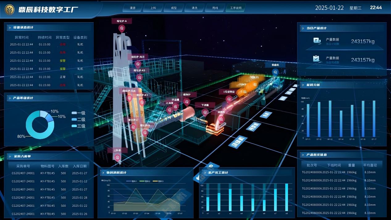 项目以车间生产过程及质量管理为核心切入,对生产任务、设备状态、批次质量等信息进行数字化、智能化管理,为该企业建立适应于铜加工行业的“数字工厂”平台。鼎辰科技数字工厂