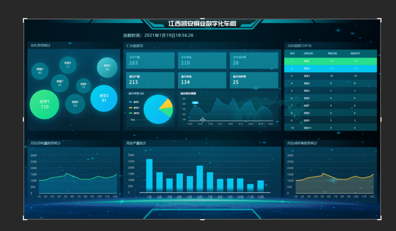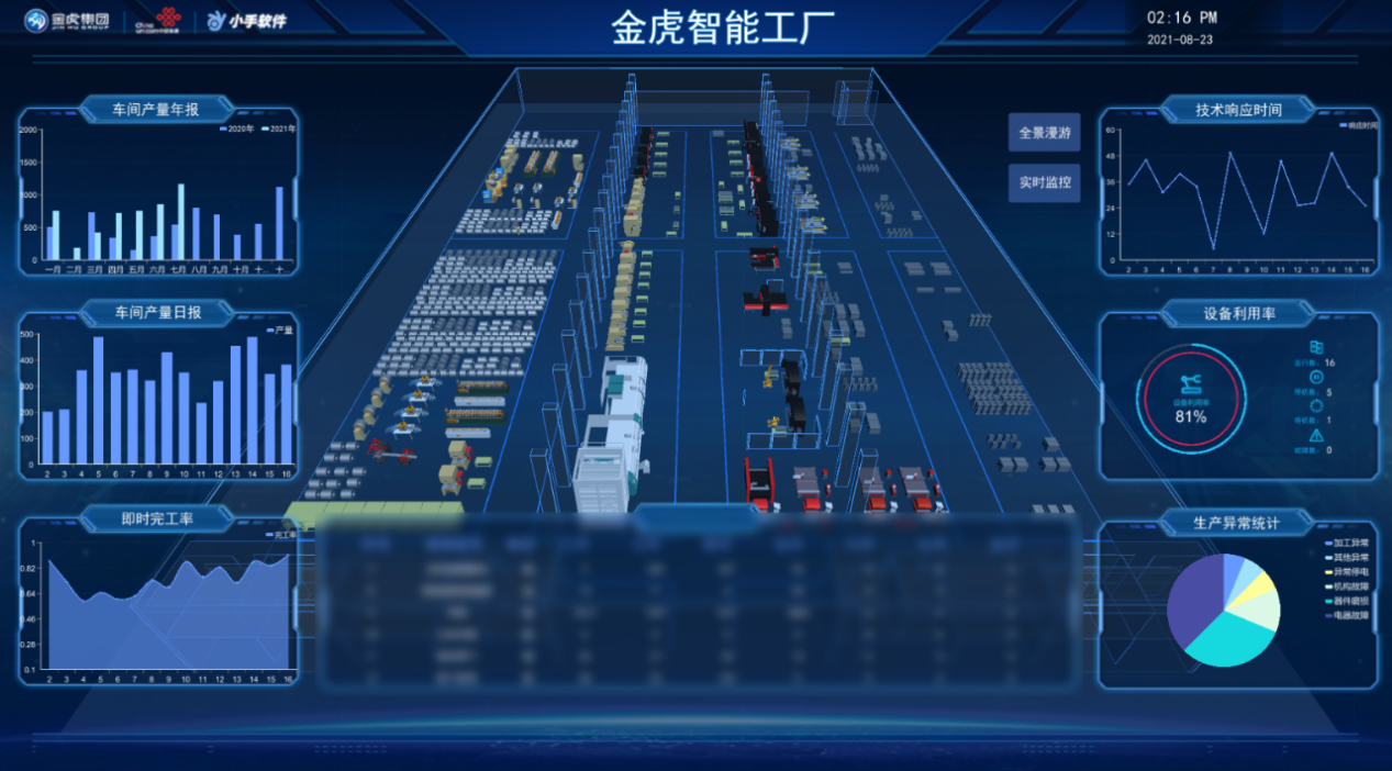 我公司在金虎集团进行的5G+智能工厂、智能制造执行系统等项目,可完整采集设备运行状态及运行参数信息,采集每一台设备的实时加工完成数量,并以可视化方式实现现场展示。该项目建立了生产过程数字化管理平台,显著提高了车间现场生产管理效率
